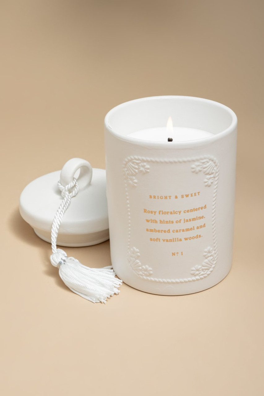 – Add a touch of spring to your space with this warm scented candle. Notes: Warm rose, white floral jasmine, ambered caramel, and soft vanilla woods.