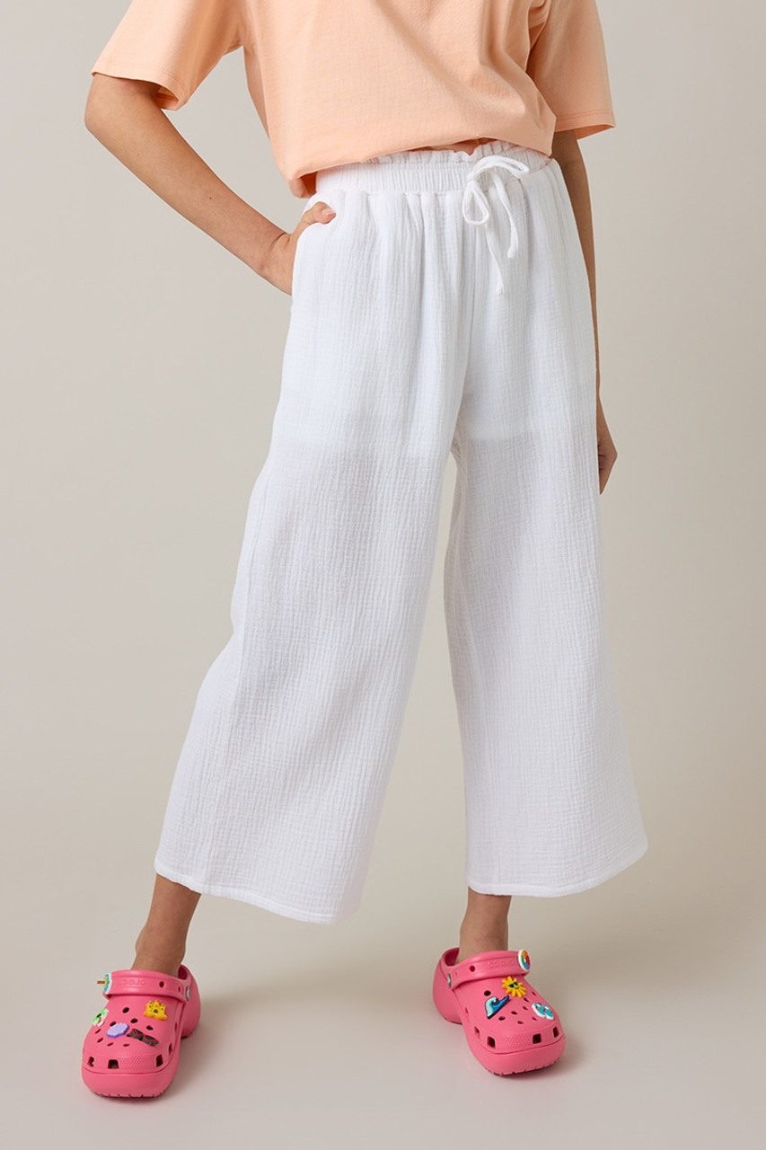 – Elastic waist, short lining, cropped pant in a comfy gauze fabric.