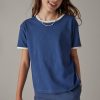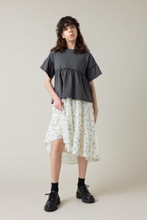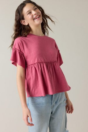 – Short sleeve, drop shoulder babydoll top that has a relaxed fit.