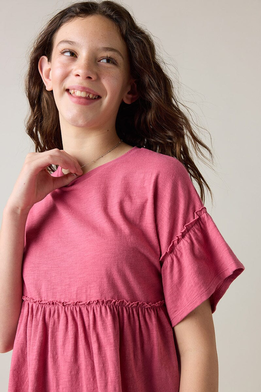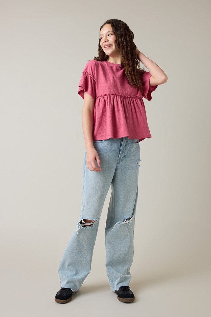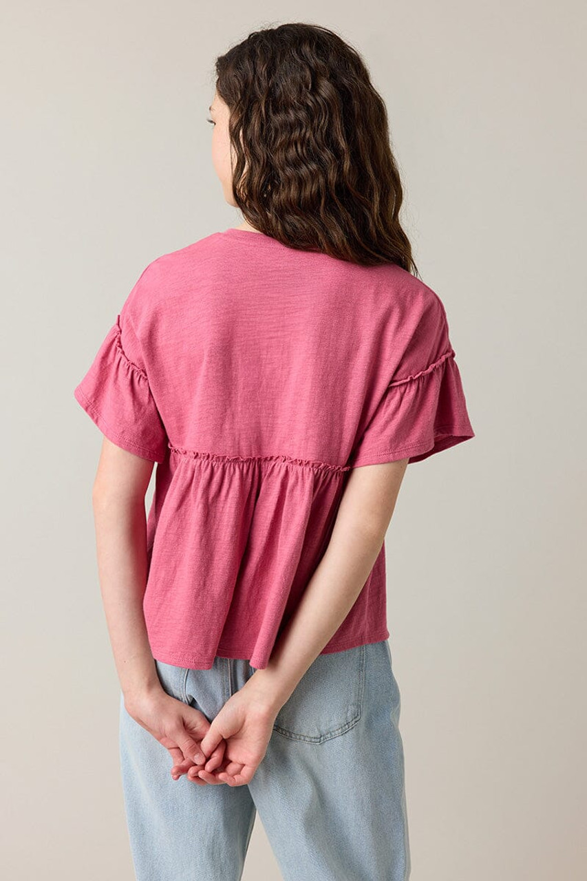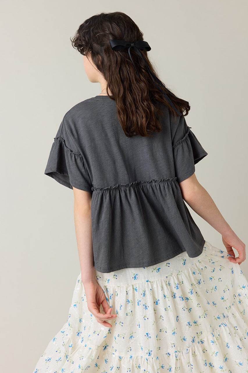 – Short sleeve, drop shoulder babydoll top that has a relaxed fit.