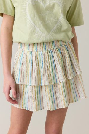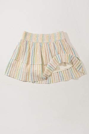 – Elastic waist, two tiered ruffle skirt with a multi colored lurex stripe.