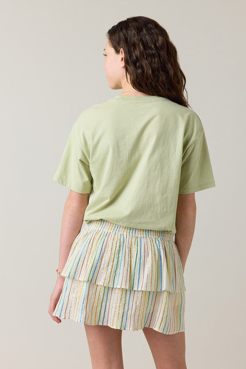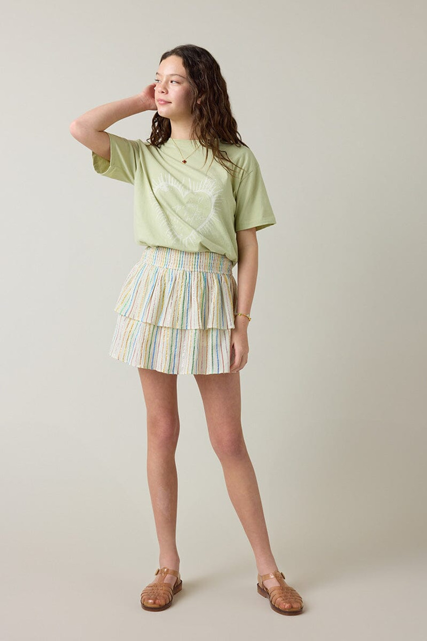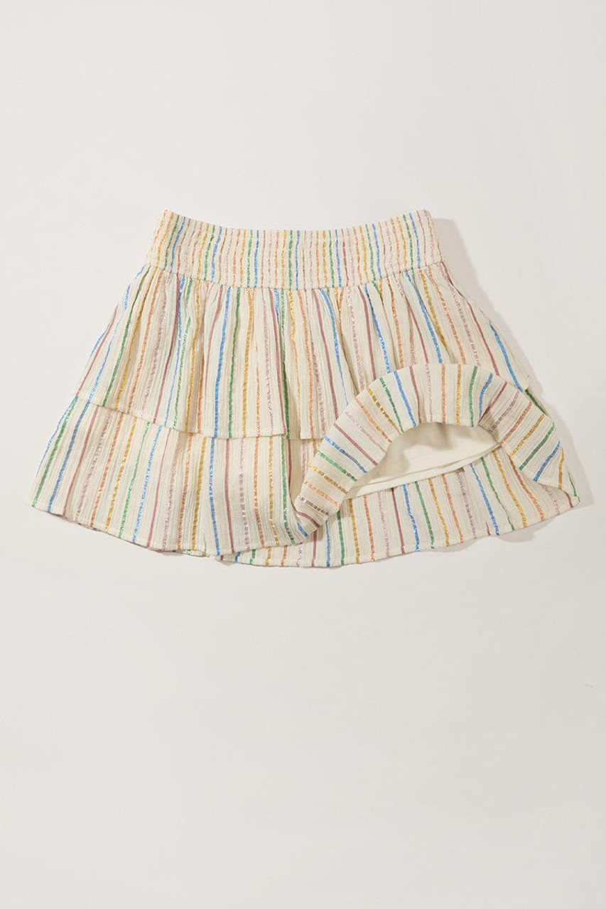 – Elastic waist, two tiered ruffle skirt with a multi colored lurex stripe.