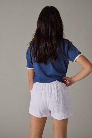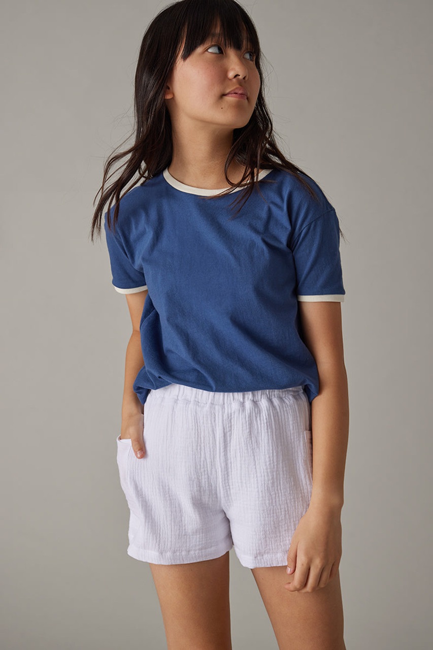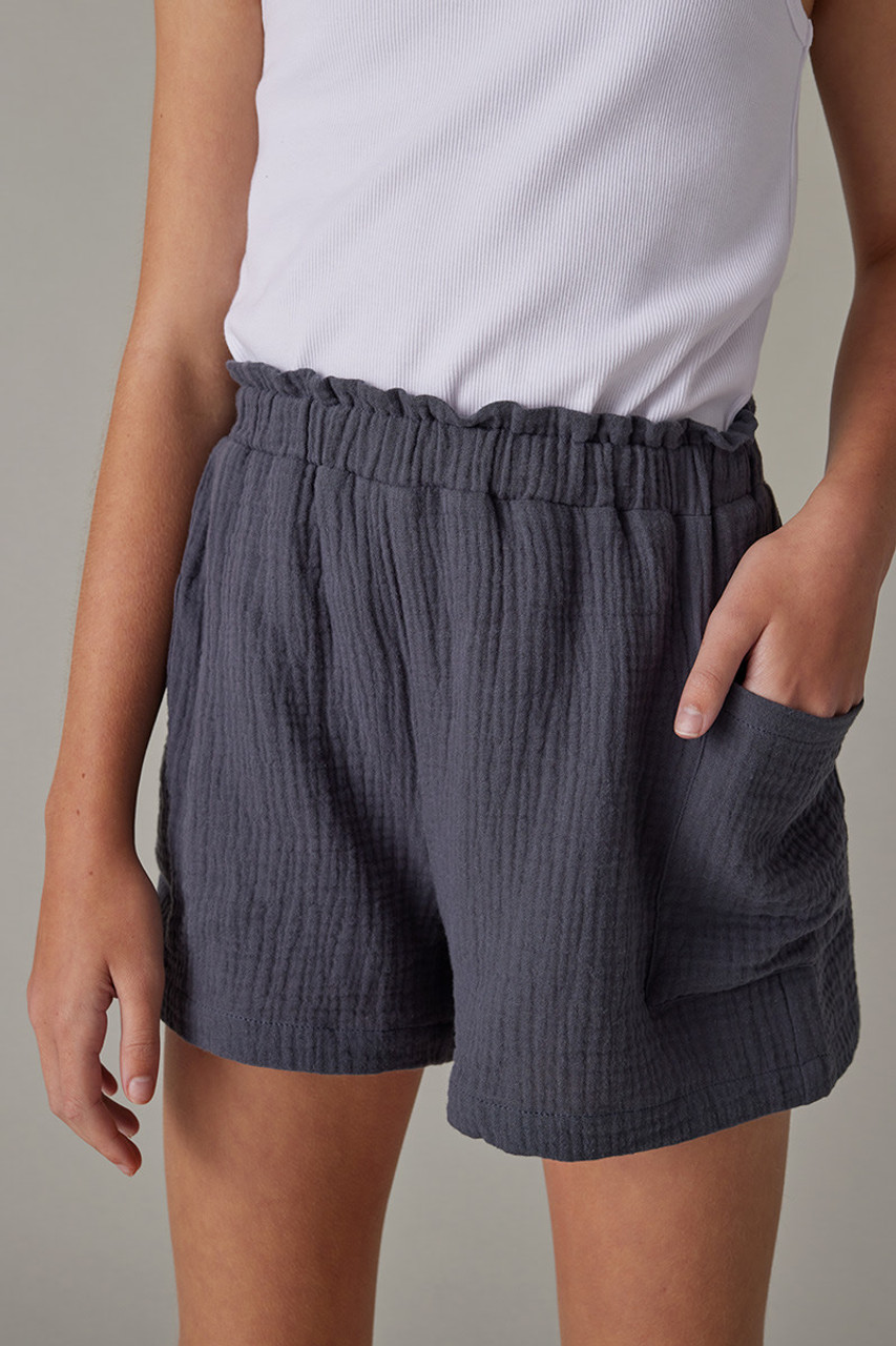 – Pull -on style with a smocked waist line and comfy/light weight gauze fabric.