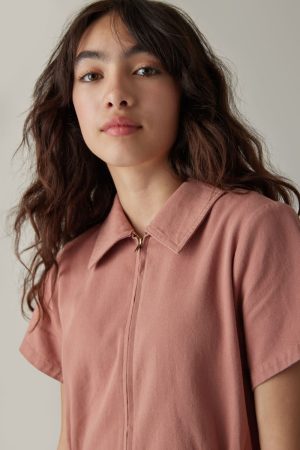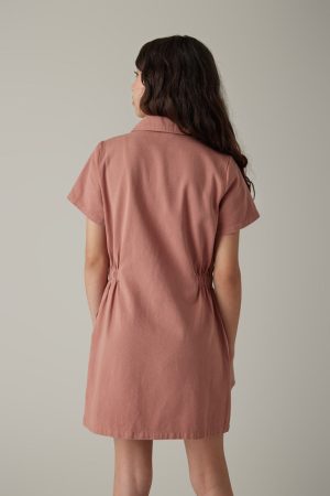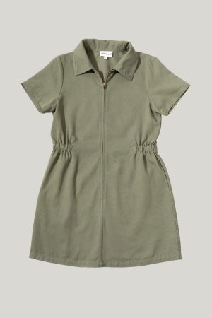 – Short sleeve, utility style dress that features a zip up front detail and cinched waist.