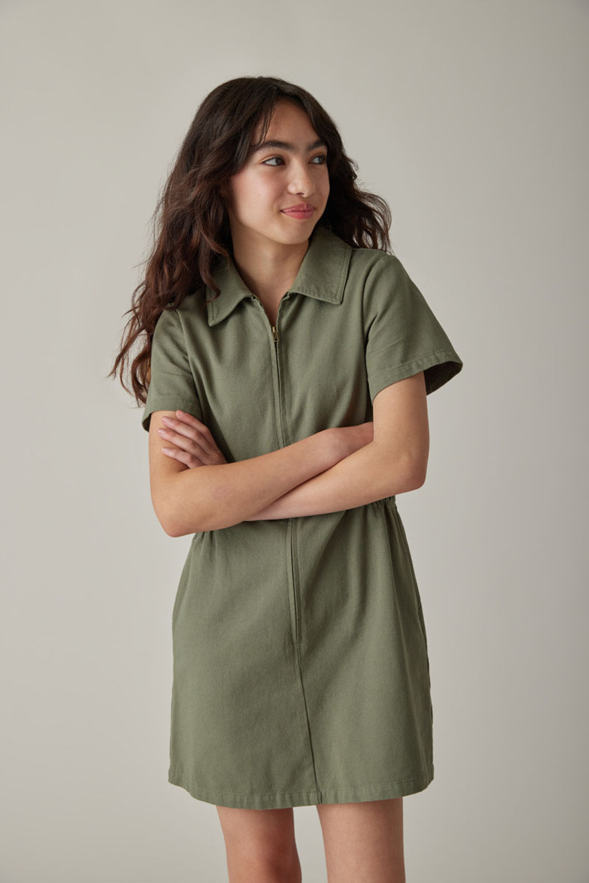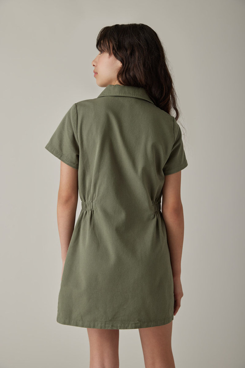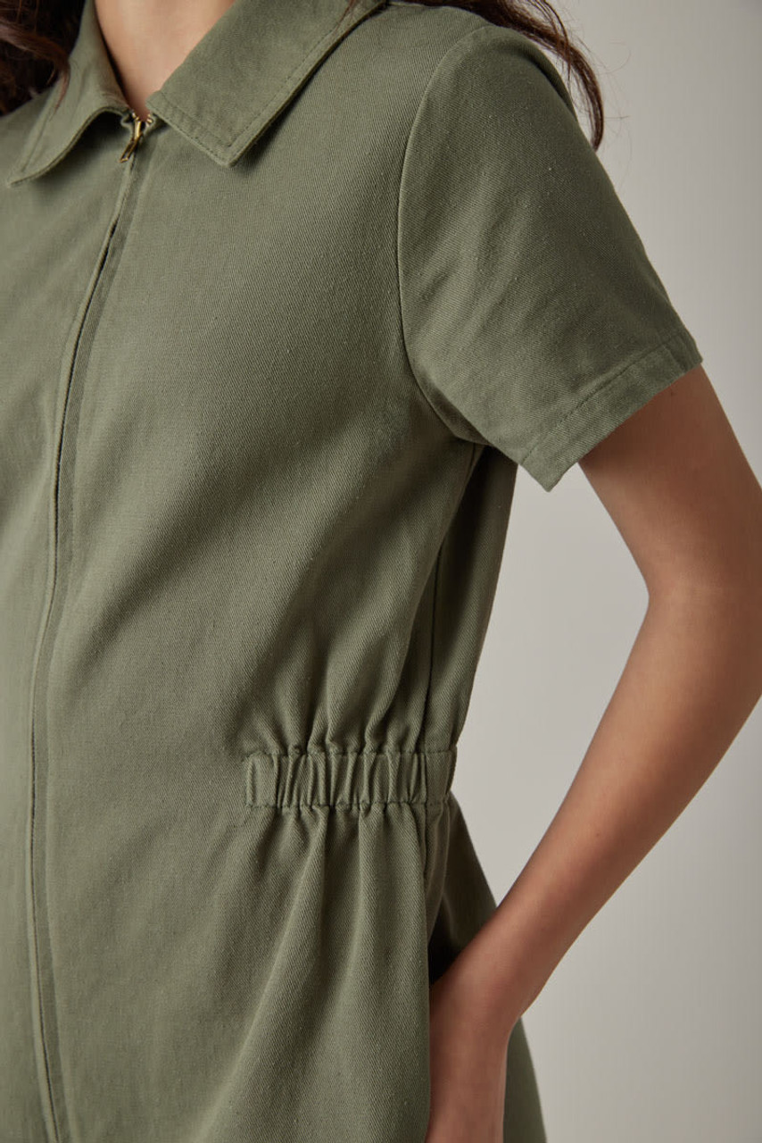 – Short sleeve, utility style dress that features a zip up front detail and cinched waist.