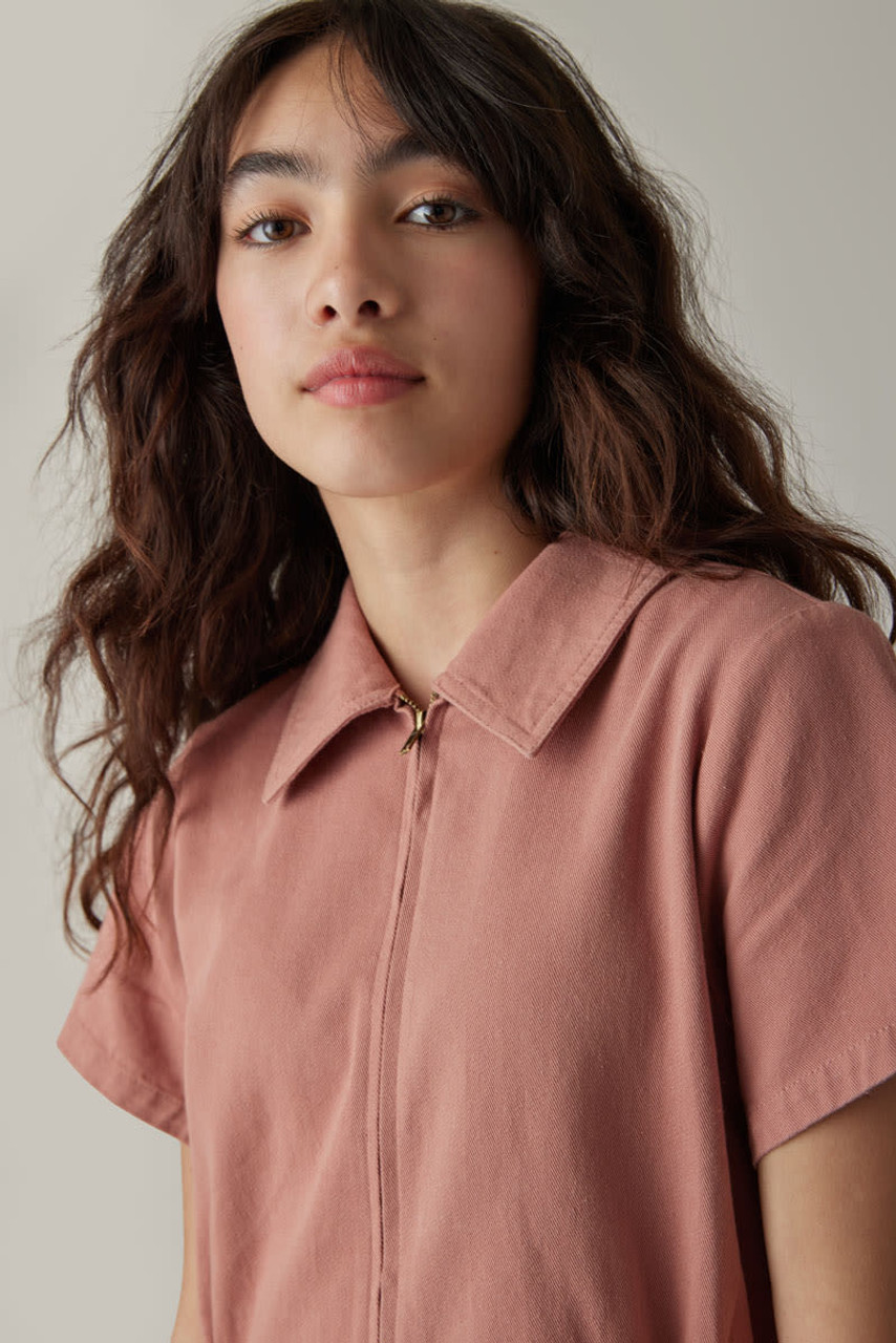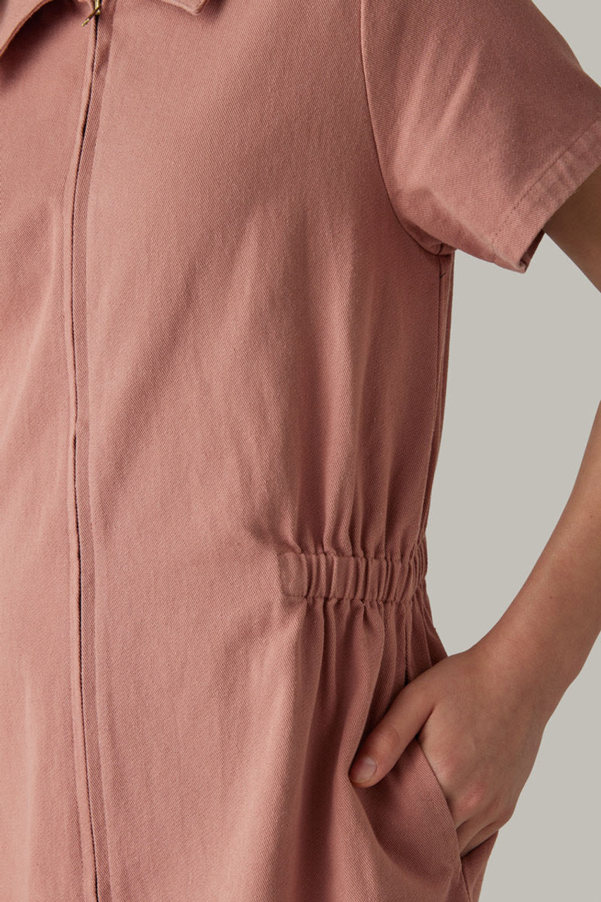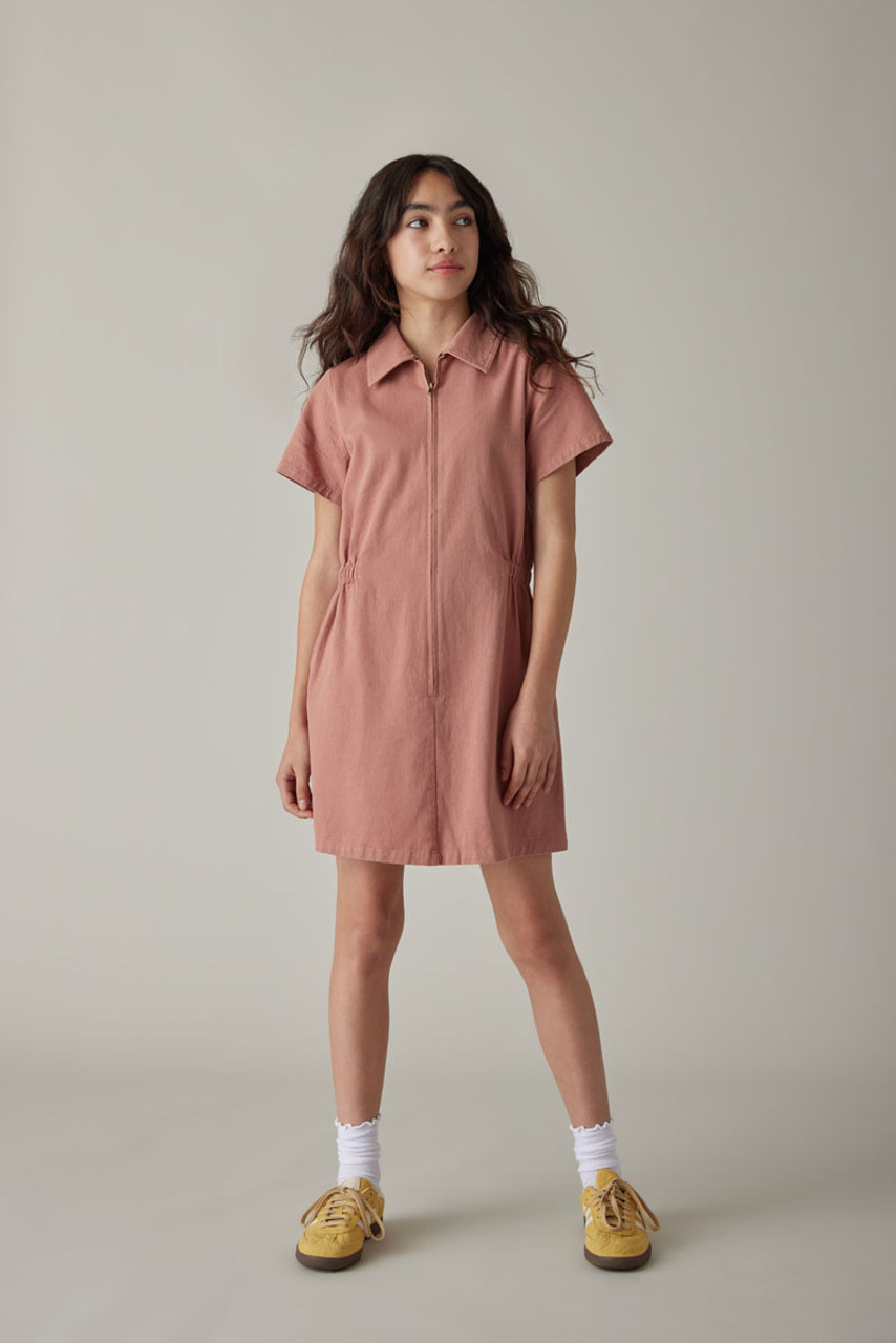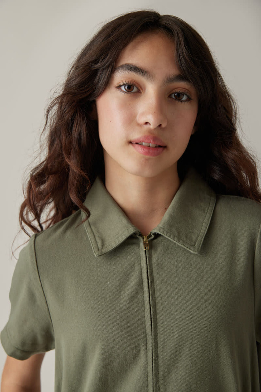 – Short sleeve, utility style dress that features a zip up front detail and cinched waist.
