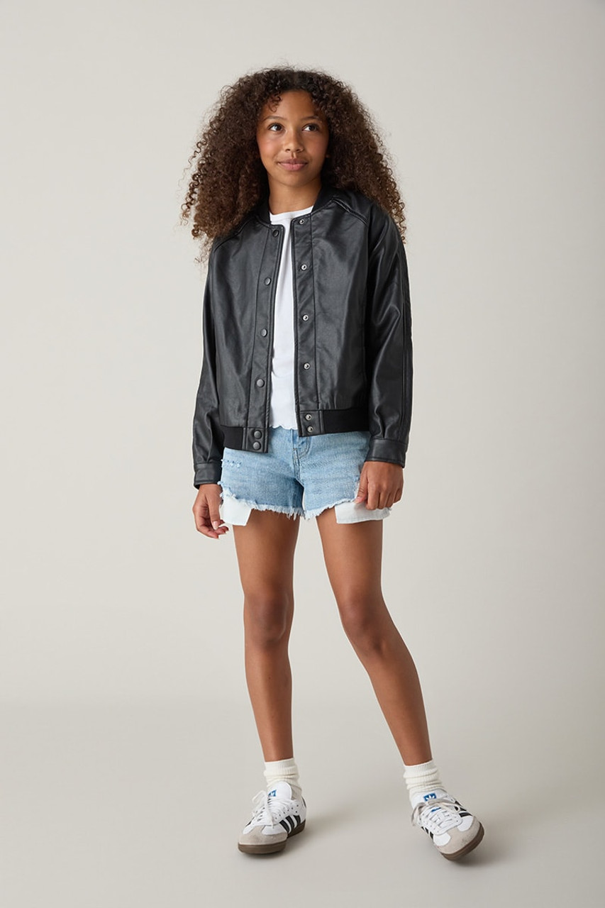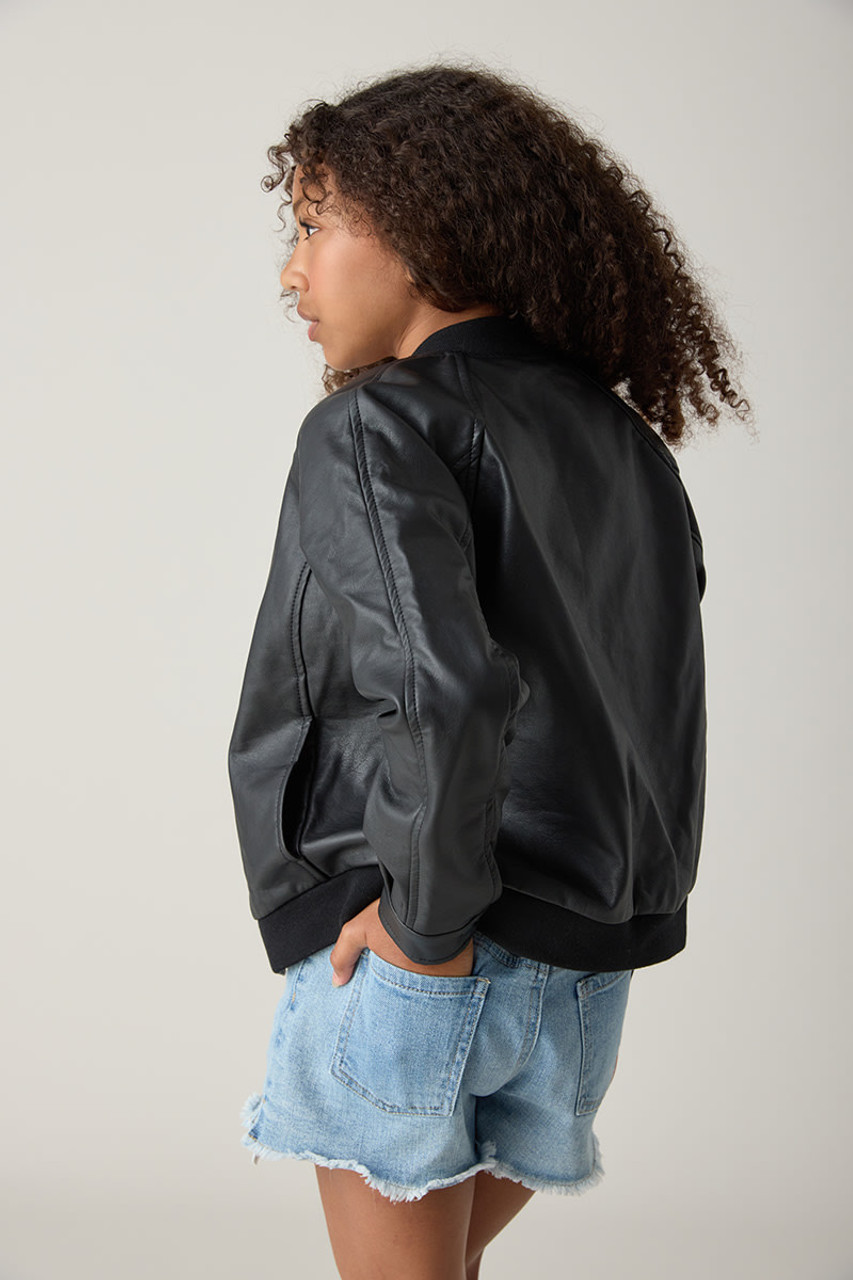 – A vegan leather bomber jacket featuring a round neckline, zip-up front closure, dropped shoulders, long sleeves, and front pockets.