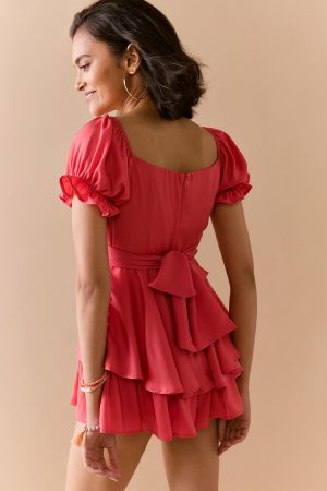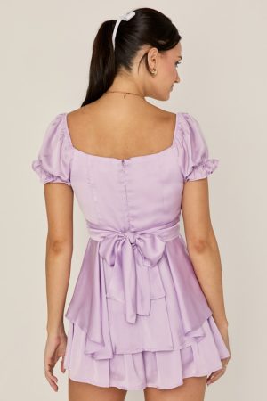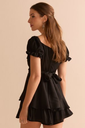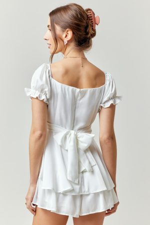 - Short puff sleeves with elasticized ruffle cuffs.